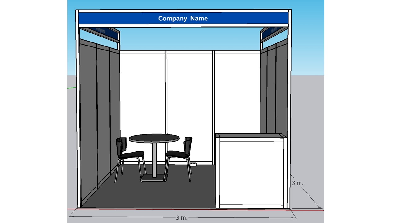 This booth is a corner booth with two sides open, with two sides fascia boards. It includes a 3mx3m exhibit space with white wall panels and fascia board, one information counter (lockable), one round table, 2 chairs, carpet furnished, a 5amp power supply socket, and two fluorescent lights.