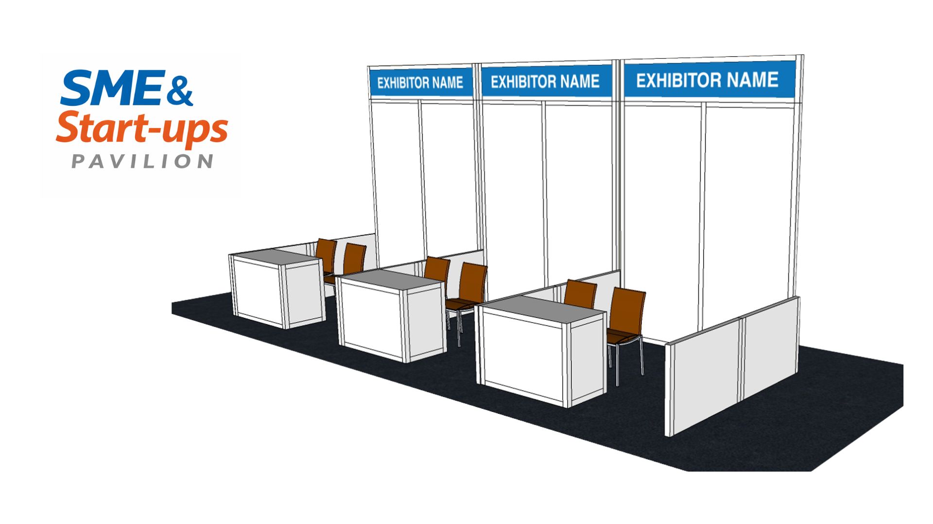 It includes 2x2m shell scheme booth (as shown in the below picture). The booth includes back wall panels with fascia board, one lockable information counter, two chairs, one power-supply socket, 1 unit of LED armed spotlight and carpet furnished.